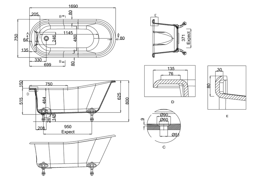 Arcade Bathrooms Stackville Slipper Roll Top Bath 1690x750mm