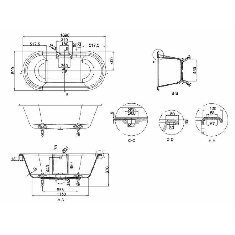 | Displaced capacity : 162 litres (bath's capacity less 70 litres) |
