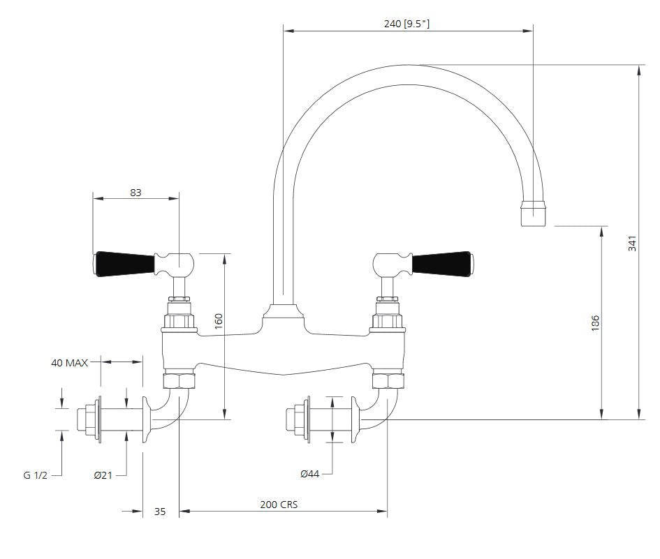 Lefroy Brooks Classic Black Lever Wall Mounted Bridge Kitchen Sink Mixer (choose finish)