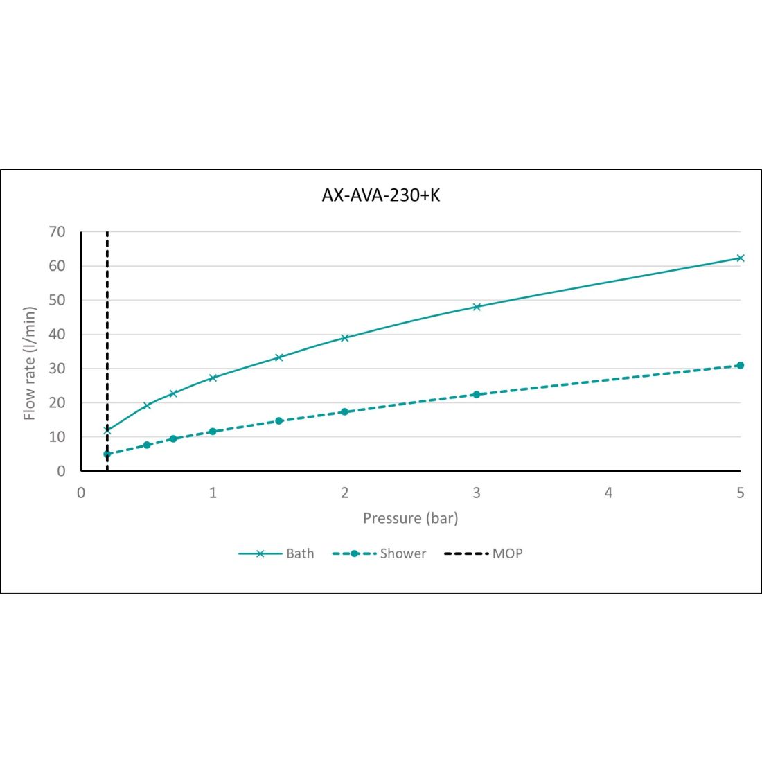 | Flow Rate (at 3.0 Bar Flow Pressure) | Bath fill at 3 bar water pressure allows for 48 l/m, at 1 bar allows for 27.2 l/m. Showering at 3 bar water pressure allows for 22.4 l/m, at 1 bar allows for 11.5 l/m |